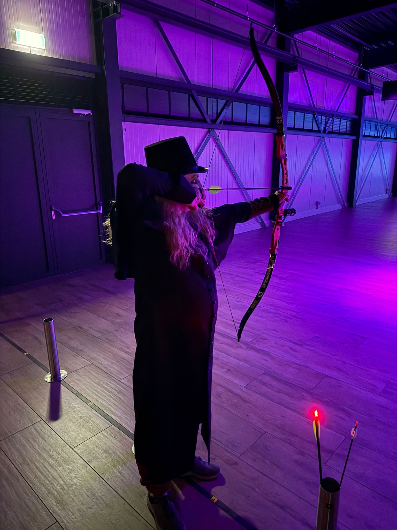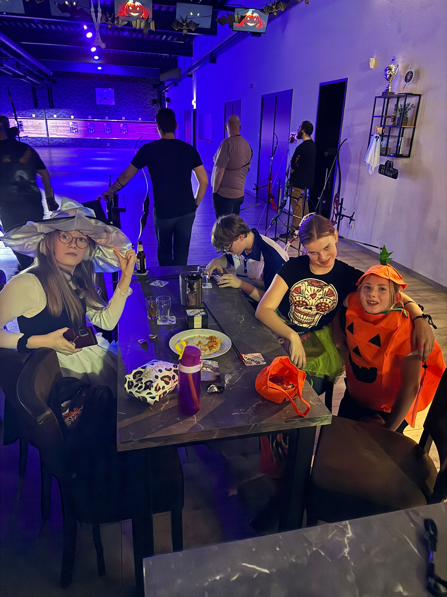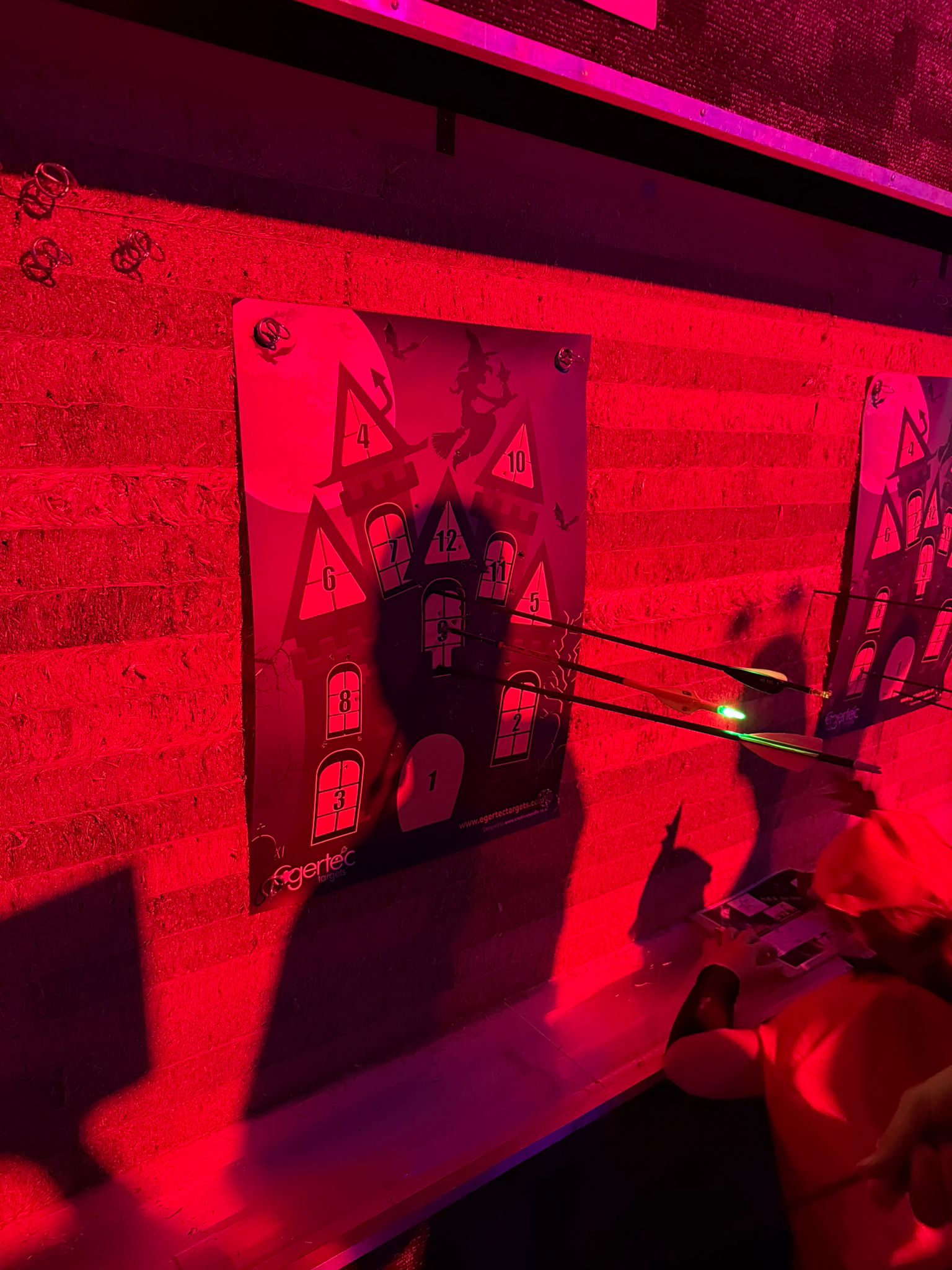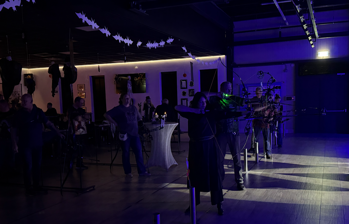 Het was zaak voor onze schutters om zoveel mogelijk punten bij elkaar te schieten op de speciale “haunted house”-blazoenen. En dat bleek nog niet zo gemakkelijk te zijn, want natuurlijk vindt een Halloween wedstrijd niet plaats met de lampen aan… speciaal voor deze avond was er een lichtshow geprogrammeerd waarbij de blazoenen niet altijd goed zichtbaar waren. Een leuke en tikkeltje frustrerende uitdaging, waarbij niet iedereen zijn hoofd koel wist te houden en punten te schieten 😉.